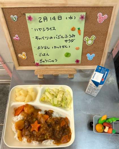 ハヤシライス・キャベツのバジル風味サラダ・洋梨(カット缶)・ごはん・牛乳