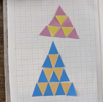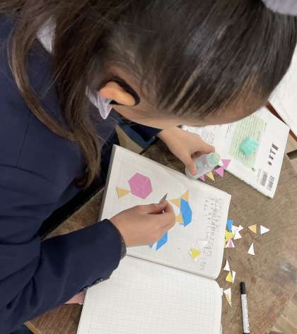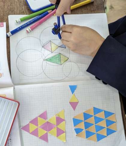 角の大きさや辺の長さに注目しながら三角形同士を組み合わせて模様作りなどもしました。