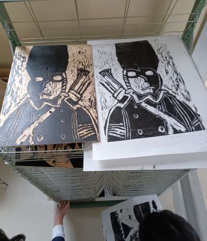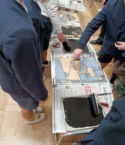 木版画の仕上げで、刷りあげています。友だちにやり方を教えながら、協力して取り組んでいます。