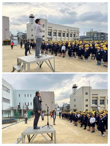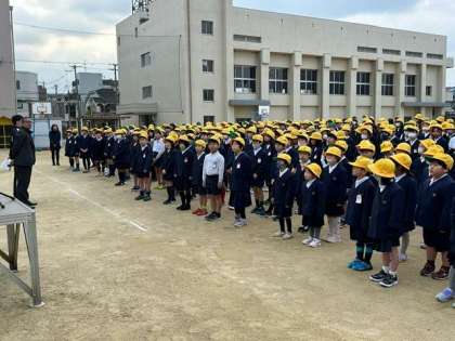 全校朝会では、生活指導や看護当番の先生から、横断歩道の歩行や帽子の着用など、安全な登下校について話がありました。