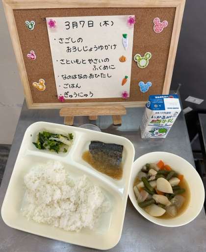 さごしのおろし醤油かけ・さといもと野菜のふくめ煮・菜の花のおひたし・ごはん・牛乳