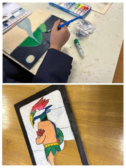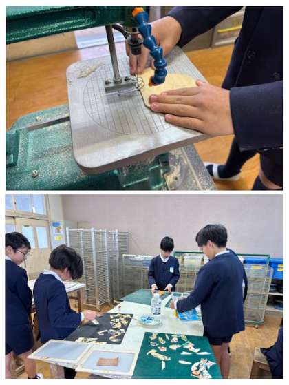 5年生は、合板に絵をかき、糸のこぎりを使って加工しています。