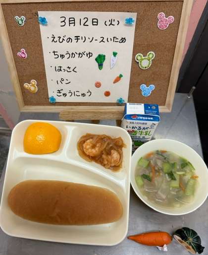 えびのチリソース炒め・中華がゆ・はっさく・パン・牛乳