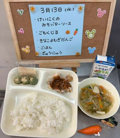 鶏肉のみそバターソース・五目汁・きなこよもぎ団子・ごはん・牛乳