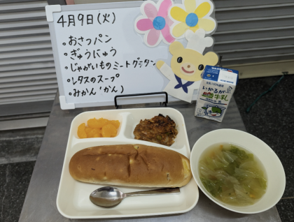 今日の給食は、おさつパン、牛乳、じゃがいものミートグラタン、レタスのスープ、みかん(缶)です。