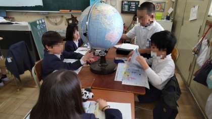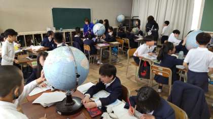 5年生は、社会科の時間に3つの海洋や、7つの大陸、罫線や緯線を地球儀を使って調べていました。太平洋と大西洋の「太と大」の字を間違えないようにね。