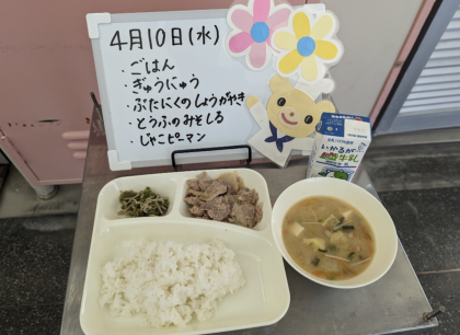 今日の給食は、ごはん、牛乳、豚肉のしょうがやき、とうふのみそしる、じゃこピーマンです。
