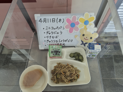 豚肉を主材にしたソース味の焼きそばは、児童に人気の献立です。1年生の教室でもおいしい!と大好評でした。
