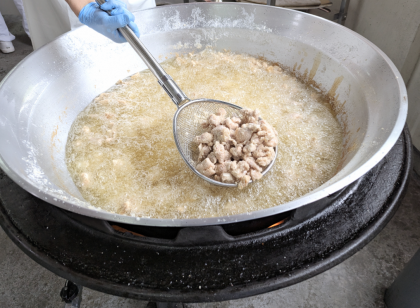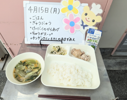 今日の給食は、ごはん、牛乳、けいにくのからあげ、ちゅうかスープ、チンゲンサイともやしのあまずあえです。