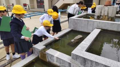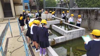 3年生は、担任の先生と理科専科の先生に連れられて、校庭の動植物の観察をしていました。虫眼鏡を持って、メダカや八重桜、白とピンクのハナミズキ、アブラナの花などを見ていました。チューリップはほとんど花が散ってしまいました。