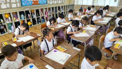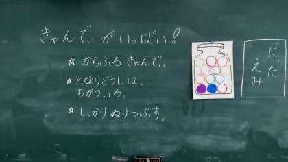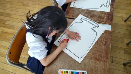 1年生は、入学から初めてクレパスを使った学習に取り組んでいました。クレパスとガーゼの出し方やクレパスの使い方を勉強しました。瓶に入れたきれいなキャンディーを白いところがないように塗っていました。