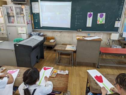 2年生は、「春見つけ」をしました。タブレットで撮影してじっくり観察しました。その後、パスでチューリップを描きました。花びらを工夫しました。