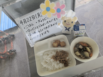 今日の給食は、ごはん、牛乳、鶏肉とじゃがいもの煮もの、あつあげのしょうゆだれかけ、紅ざけそぼろです。