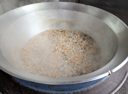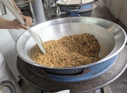 いりごまを乾煎りし、鮭、料理酒、みりん、うすくちしょうゆ、湯を加えて更に煎り、最後に青のりを加えて作りました。焦げないように火加減に注意しながら作ってくださいました。