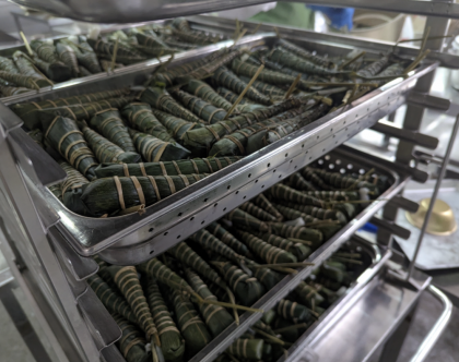 大阪市の給食では、こどもの日の行事献立に「ちまき」が毎年登場します。ちまきは、米粉などで作った餅を笹の葉で包み、い草で巻いて作られています。「こどもが元気に育ちますように」という願いがこめられています。