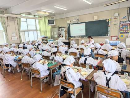 各学級では、こどもの日の行事食についてや、ちまきの食べ方についての給食指導がありました。1年生の教室では、はじめて食べるちまきにわくわくしている児童がたくさんいました。「もちもちでおいしかった!」「ちょっと苦手だったと」1口だけチャレンジしている児童もいました。