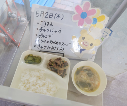今日の給食は、ごはん、牛乳、プルコギ、とうふとわかめのスープ、きゅうりの甘酢づけです。