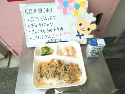 今日の給食は、豚丼、牛乳、きゅうりの梅風味、白玉だんご(きなこ)です。