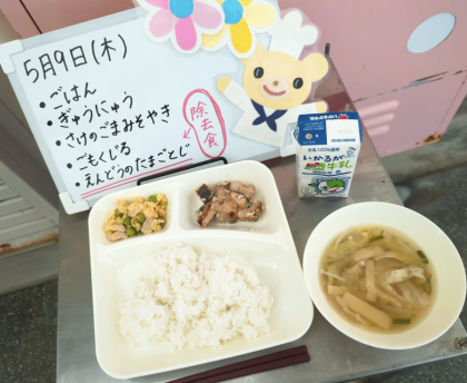 今日の給食は、ごはん、牛乳、鮭のゴマ味噌焼き、五目汁、えんどうの卵とじです。