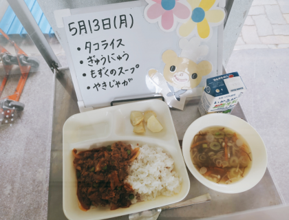 今日の給食は、タコライス、牛乳、もずくのスープ、焼きじゃがです。