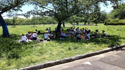 少し早いですが、お弁当を食べています。雲一つありません。遊具もかわいていました。