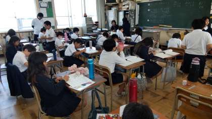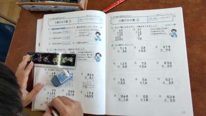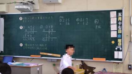 5年生の算数は、2桁×2桁の小数のかけ算を学習していました。小数点の移動がキーポイントです。子どもたち、がんばって計算していました。