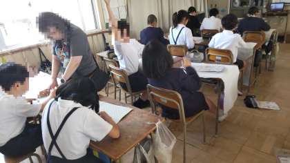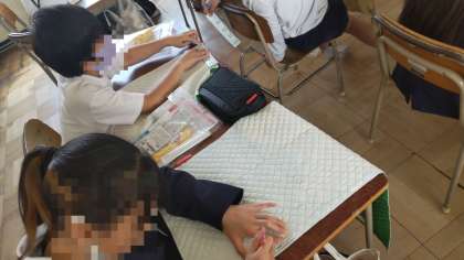 6年生は家庭科で「ナップザック作り」に取り組んでいます。今はまだ布の端を折り返したり、チャコペンシルで印をつけたりする作業です。