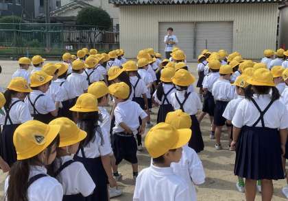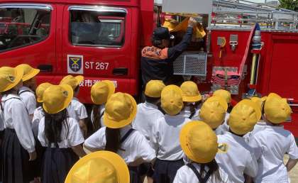 1年生は地震を想定した避難訓練の後、防災に関するDVDを視聴し、新聞紙を使ったスリッパ作りをしました。また、最後に消防車の見学もさせて頂きました。