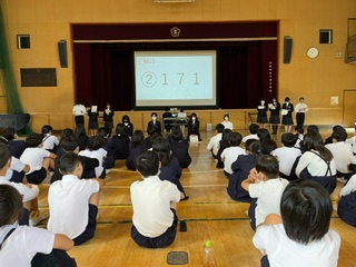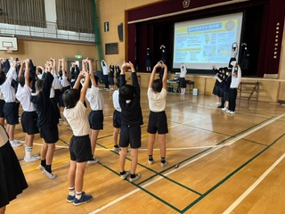 今週は本当に忙しかったですね。本日の土曜授業は、昨日と打って変わって清々しい天気になりました。本日の前半は、避難訓練を行いました。避難時間は3分22秒となかなか早く避難することができました。後半は、講堂に移動して白鷺中学校の生徒さん〔ALT)から防災減災のお話やクイズ、身体を動かす遊びなどをしていただきました。自分達の先輩から色々教えていただいて、とてもためになったみたいでした。ご家庭でも防災減災のことを話し合ってくださいね。