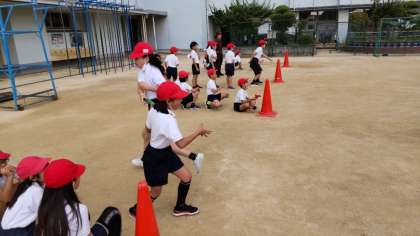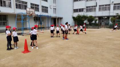 4年生は、運動場で体育の時に「リレー」をしていました。運動場の体育はしばらくお休みです。、来週から「プール水泳」に入ります。クラスで4つのてチームに分かれて「リレー」に盛り上がっていました。「回旋リレー」は、子どもたちがとっても好きな運動です。