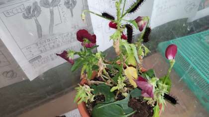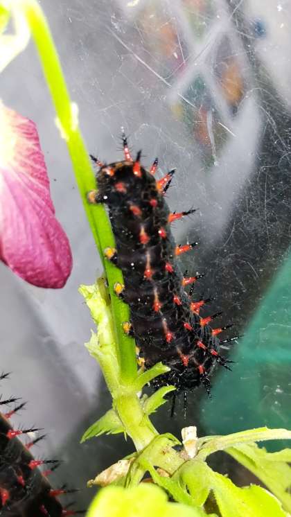 学校の花壇のパンジーにツマグロヒョウモンチョウの幼虫がいました。黒にオレンジのてんてん、刺されそうなからだの突起物、とってもグロテスクです。