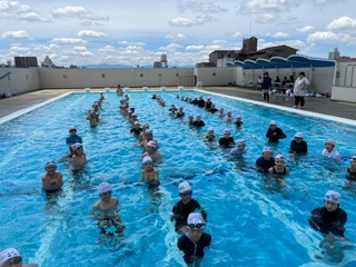 6月10日、今日はプール開きです。まだまだ夏という感じではありませんが子ども達は元気いっぱい!プールでの学習について気をつける点を確認後、準備体操、シャワーに入った後いよいよプールに入りました。まだまだプールの水は冷たかったですが楽しそうに泳いでいました。これからも安全に気をつけながら入っていきます。