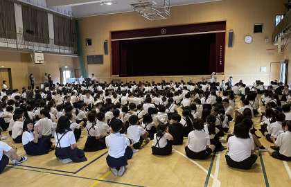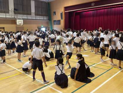 児童集会では縦割り班に分かれて、集会委員会の企画するゲームをしました。
