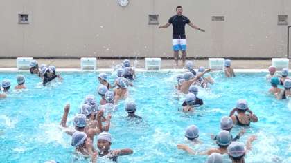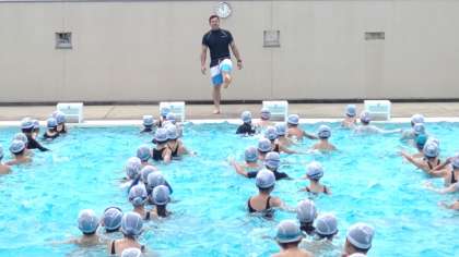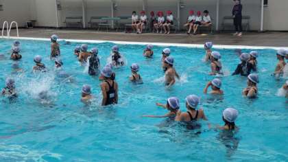 3年生のプール水泳は入水して頭まで沈んだら、リズム乗って(音楽に合わして)体を動かしていました。その中には、水中に頭をつけたり、水を押したり、たたいたり、水の中で空気を吐く動きなんかも入っていて、とても楽しそうでした。こんな水泳を「リズム泳」と言います。特に低学年から中学年までに有効です。