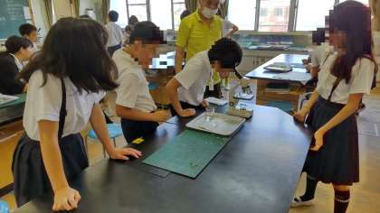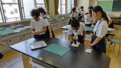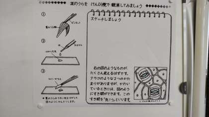 6年生は理科で、ツユクサを使って葉の裏にある気孔を観察していました。顕微鏡を使って、葉の裏の薄い皮をピンセットではがして、目のようなものを見つけてびっくりしていました。気孔はどんな植物にもあり、そこから水蒸気を出したり、二酸化炭素を吸ったりします。スイレンなどの気孔は、葉の表側にあります。また、松の葉などの針葉樹の葉の気孔をを見ても面白いですよ。
