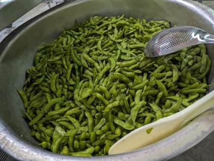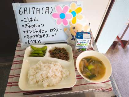 今日の給食は、ごはん、牛乳、チンジャオニューロウスー、中華みそスープ、枝豆です。