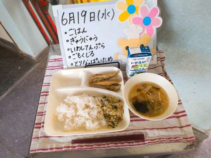今日の給食は、ごはん、牛乳、いわしてんぷら、五目汁、とり菜っ葉いためです。