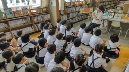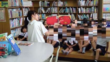 木曜日は司書さんが来られる日です。図書館では、司書さんが「本の読み聞かせをしておられました。子どもたちは静かに聞き入っていました。