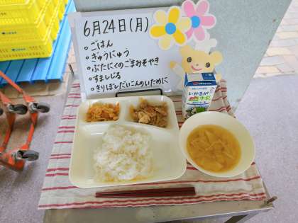 今日の給食は、ごはん、牛乳、豚肉のごまみそ焼き、すまし汁、切干しだいこんのいため煮です。