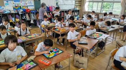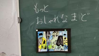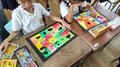 パレットの使い方、水の含ませ方、筆の使い方や絵の具の出し方など、水彩絵の具の基本的な技法を学習した後、小さな窓に絵の具で色を塗っていきました。そのあと、クレパスを使って窓に模様を描いていきました。初めて使った割には、絵の具を水と混ぜてしっかり塗れていました。