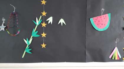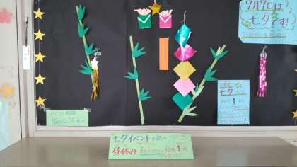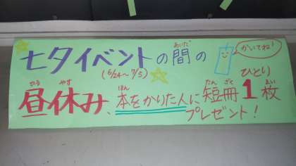 図書室の前に、七夕の掲示板が張られています。お昼休みに図書館開放で、本を1冊借りた人は、短冊に願い事を書いて貼れるそうです。たくさん本を読んで笹を飾り付けてくださいね。