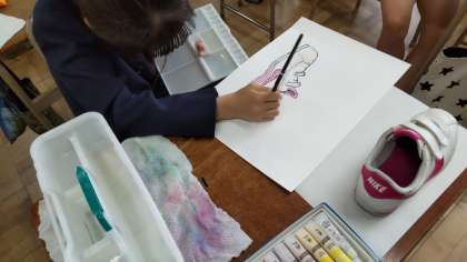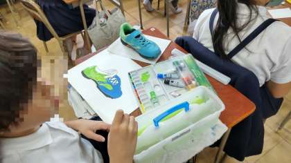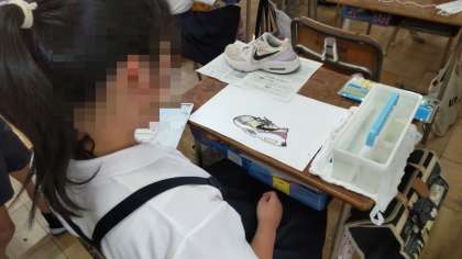 5年生の教室では、自分の運動靴を脱いで、サインペンで線描し、色を塗っていました。線描のコツは、同じスピードで滑らかに描くことです。サインペンを止めるとそこが少し点のようになり、のびやかな線が描けません。グローブや自転車などもよく題材になります。