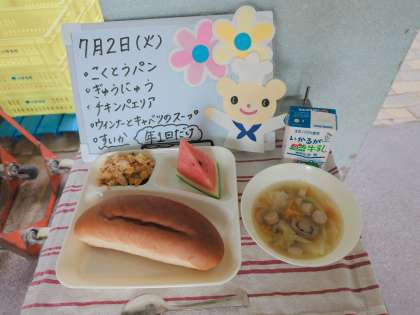 今日の給食は、黒糖パン、牛乳、チキンパエリア、ウインナーとキャベツのスープ、すいかです。