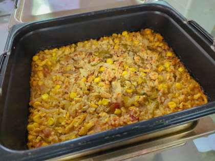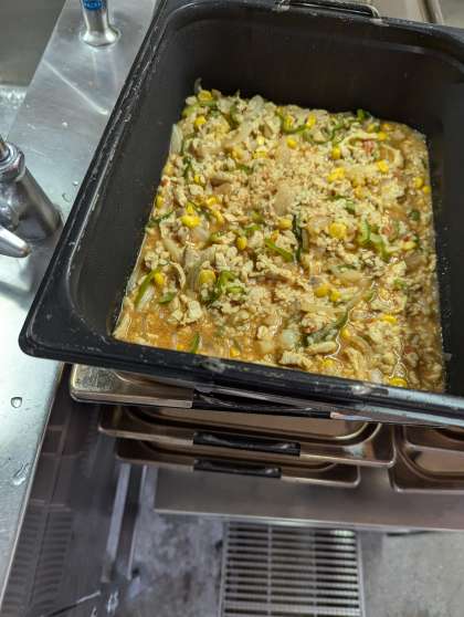 今日の給食のチキンパエリアは、鶏肉を主材に、ピーマンなどの野菜をオリーブ油でいためた後、米、調味料などを加え、ミニバットで蒸し焼きにしました。教室では、「パエリア最高!」と児童に好評でした。