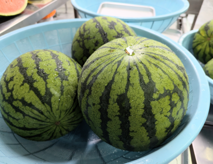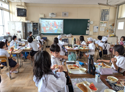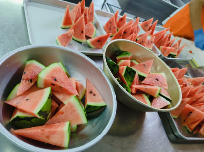 今川小学校の給食室で、すいかを切っている動画を給食の時間見ました。