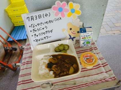 今日の給食は、夏野菜のカレーライス、牛乳、きゅうりのサラダ、みかんゼリーです。