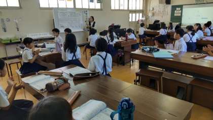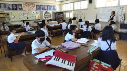 4年生は、メトロノームのような電子音が流れる伴奏(1分間に104回打つ速さ)に、手拍子でリズムをとっていました。打つところや打たないところに気を付けてリズムをとって楽しそうでした。