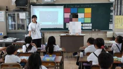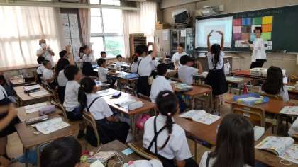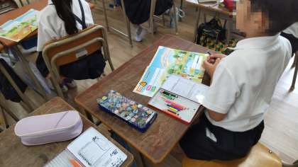 3年生の外国語活動の授業風景です。今日は色の学習。red,blue,yellow,green,pink,white,orange,purple,brownなどの色が出てきます。