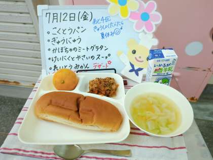 今日の給食は、黒糖パン、牛乳、かぼちゃのミートグラタン、鶏肉と野菜のスープ、冷凍みかんです。