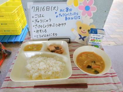 今日の給食は、ごはん、牛乳、鮭のしょうゆ風味焼き、みそ汁、冬瓜の煮ものです。